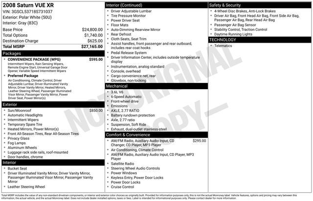 2008 Saturn VUE XR VUE XR, 4D Sport Utility, 3.6L V6 SFI, 6-Speed Automatic, FWD, Polar White, Gray Cloth.
