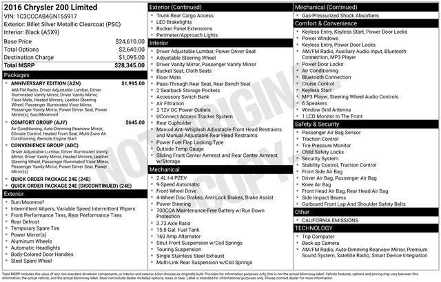 2016 Chrysler 200 Limited 200 Limited, 4D Sedan, 2.4L I4 MultiAir, 9-Speed 948TE Automatic, FWD, Billet Silver Metallic Clearcoat, Black Cloth.