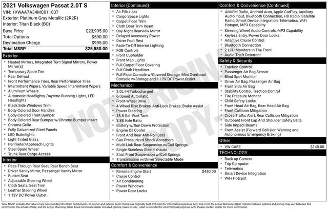 With its sleek exterior styling and impressive list of features, the 2021 Volkswagen Passat 2.0T S is the perfect choice for the discerning driver. Experience the difference for yourself and schedule a test drive today. We're confident you'll be impressed by the Passat's exceptional value and driving dynamics.